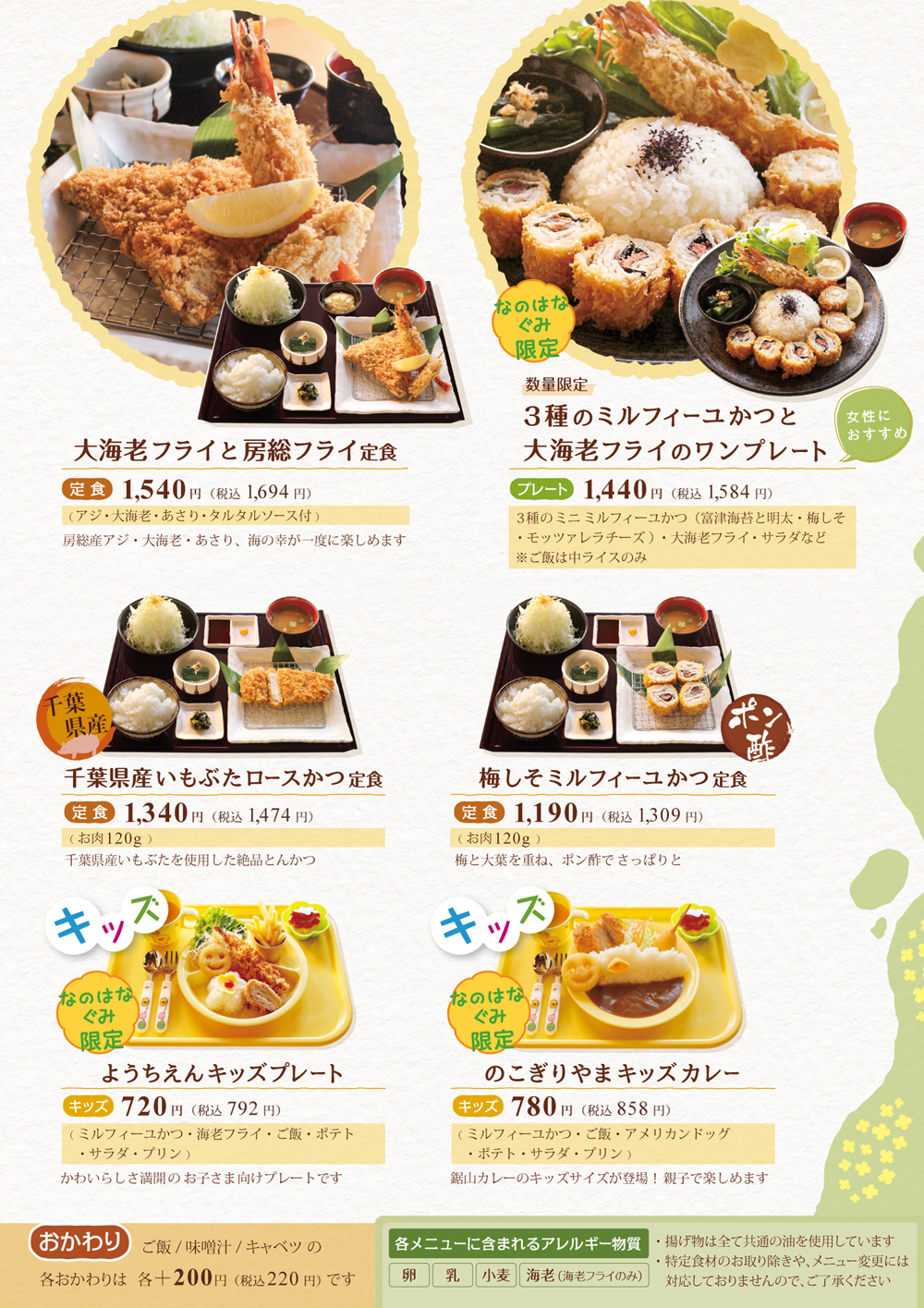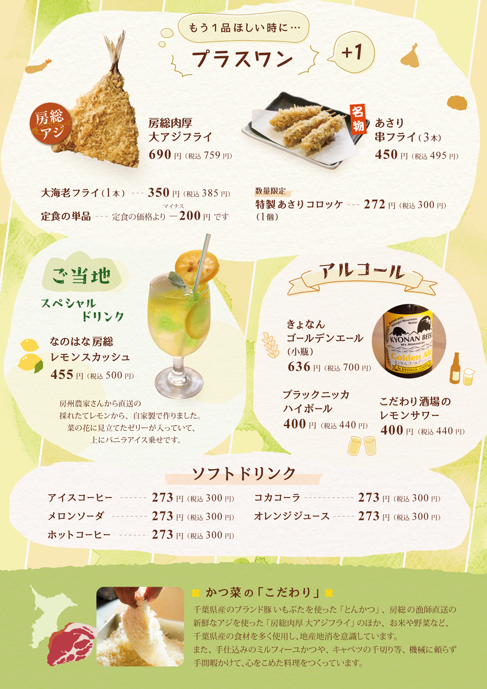 千葉県産のブランド豚いもぶたを使った「とんかつ」、房総漁師直送の新鮮なアジを使った「房総肉厚アジフライ」のほか、農家から直送のお米など千葉県産にこだわりました。